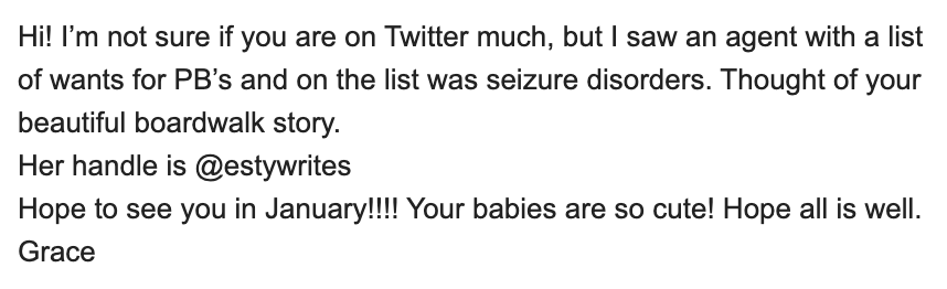 And then investing in your community. Building your network. But not just followers. CONNECTIONS. Grace and I have been to workshops together, we meet monthly for critique groups, we know each other’s portfolios inside out. I would do the same for her if I saw someone asking for a book I know she has as well as many other critique partners I am so lucky to have in my circle. If I see a MSWL asking for pirates? Sound waves? Bagels? Flower arranging? Giants? SEL? Magic? Ghosts? Farms? Dogs? Food chain? I would send the exact same email.