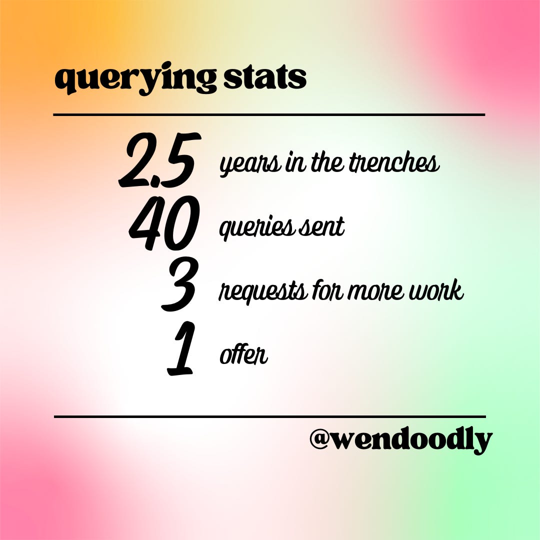 I sent that off with the highest of hopes, along with a few more queries just as 2022 came to a close. After a brief holiday break I hit the ground running and set a goal to send 100 queries in 2023.